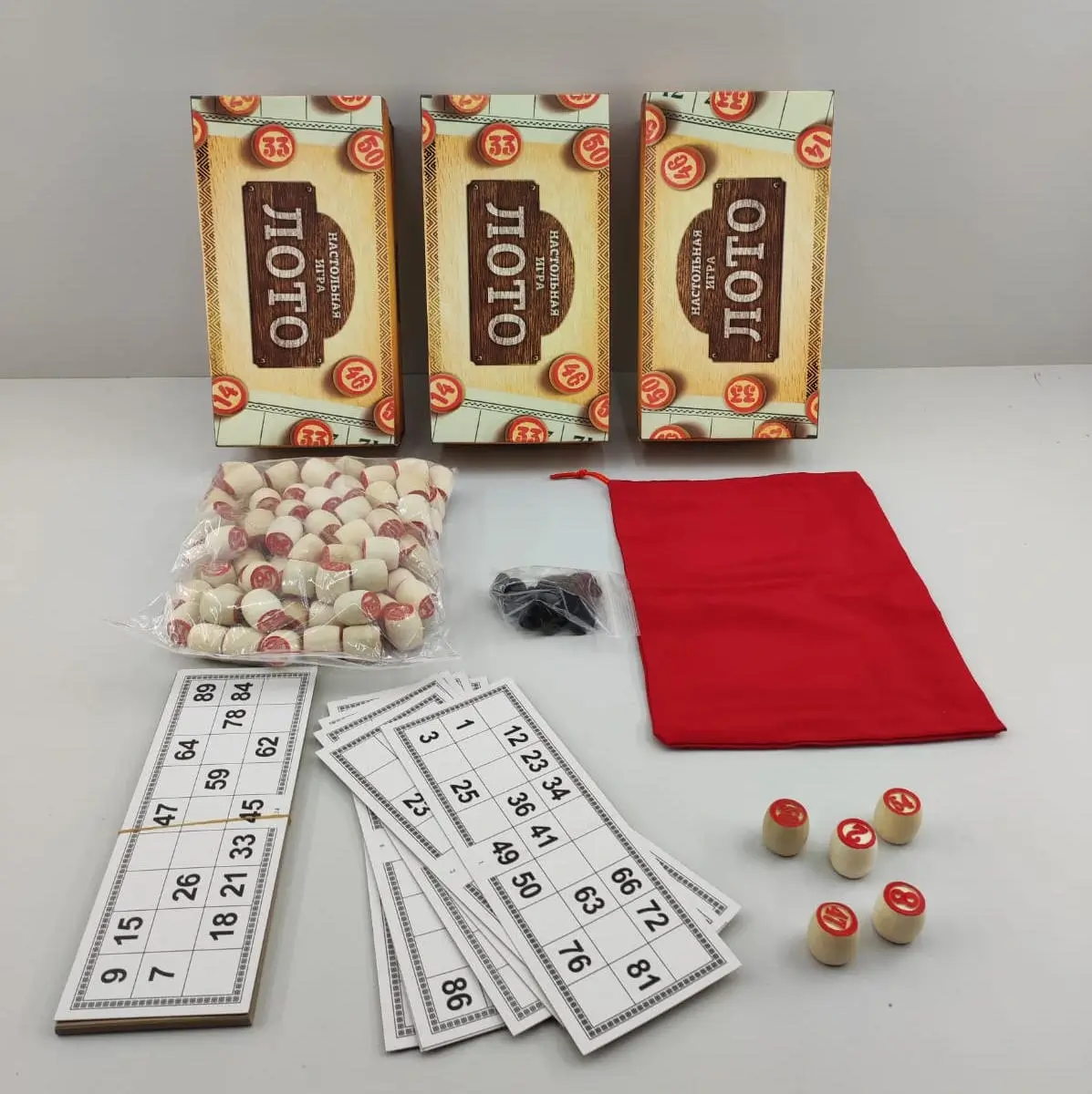 Üzərində nömrələr yazılmış 24 kart. 1-dən 90-a qədər nömrələnmiş taxta daşlar olan torba vardır. Dublikatları bağlamaq üçün çiplər (“bağlamalar”) -da daxildir.